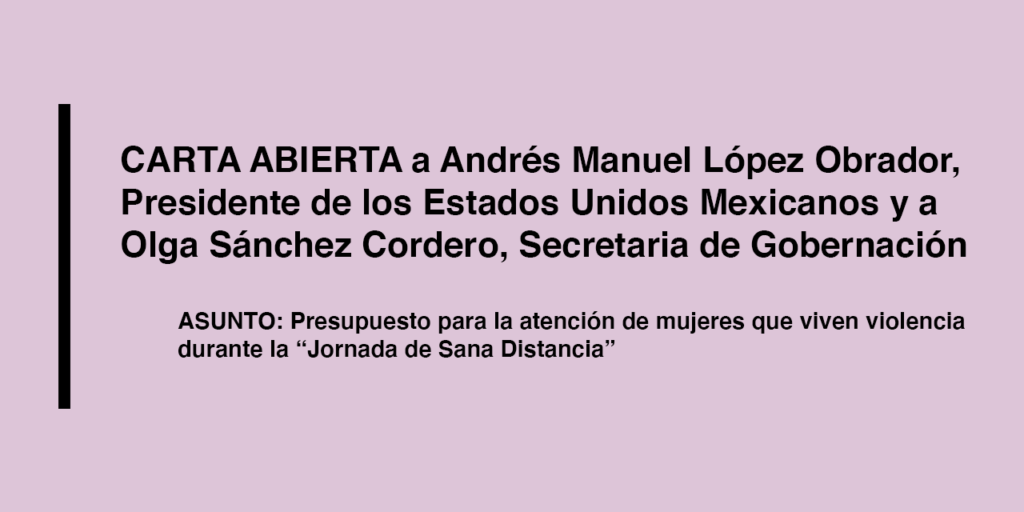 - Claridad y transparencia sobre el monto y los mecanismos a través de los cuales se van a ejercer los recursos destinados a atender las violencias contra las mujeres durante y después de la contingencia