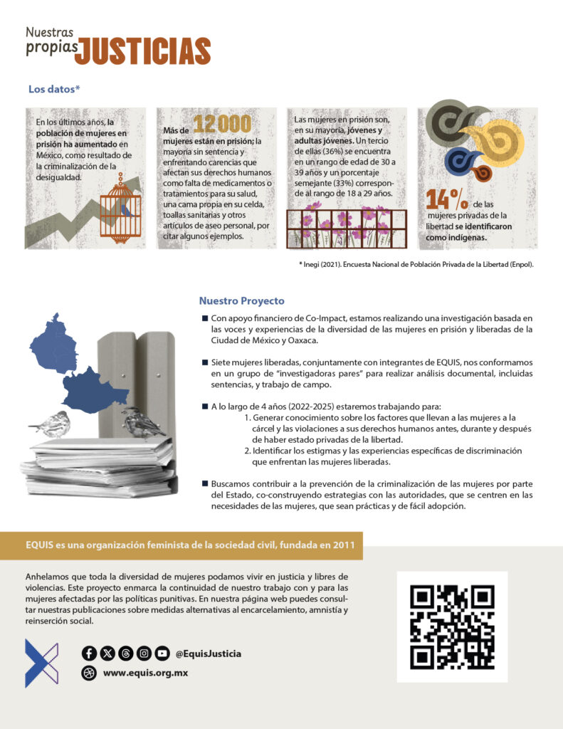 Desde 2020, frente a la necesidad de defender los derechos de las mujeres que se encuentran dentro y fuera de prisión y orientar a sus familiares; reducir el estigma y la discriminación hacia esta población; así como de visibilizar la relevancia de políticas públicas que permitan tener un proceso de reinserción social efectivo. EQUIS se articuló con colectivos y organizaciones integradas y lideradas por mujeres ex privadas de la libertad.